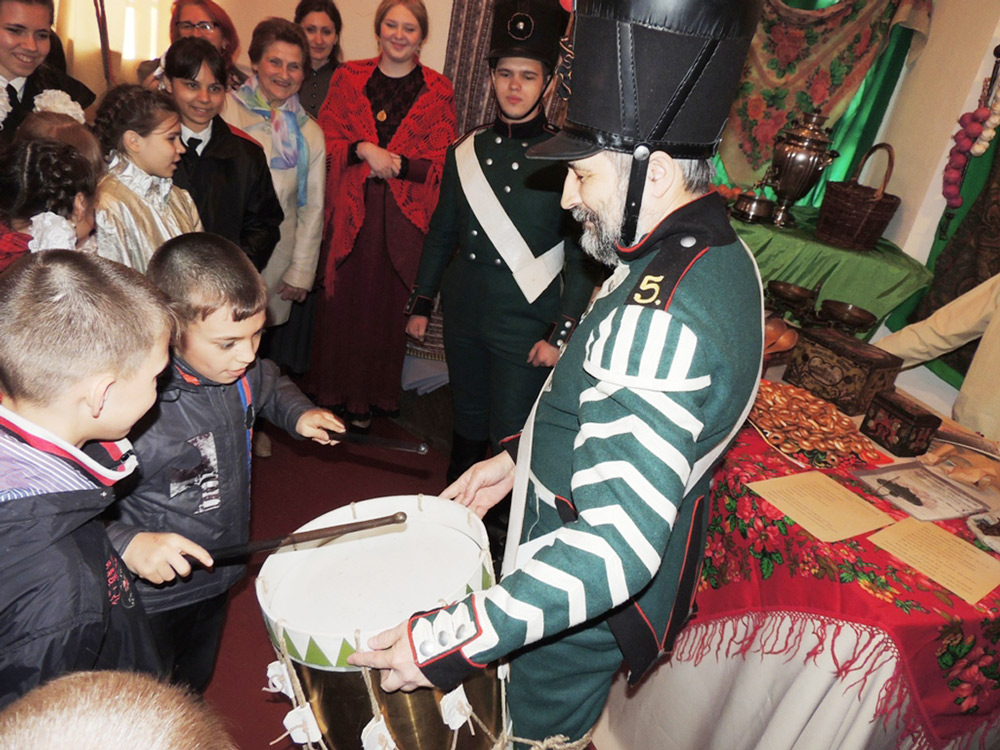 Заключительным пунктом акции стал музей-заповедник «Кузнецкая крепость. Мы стали свидетелями и участниками важного события – прибытия в город крепостного гарнизона. Появление артиллерийской команды оживило и всполошило размеренную жизнь уездного города. Мы познакомились с веселыми артиллеристами, которые, в парадных мундирах, чеканя шаг под звуки барабанной дроби, вошли в город. С восторгом откликнулись дети на предложение артиллеристов взять в руки барабанные палочки и отбить дробь. Особенно громко и ритмично это получилось у Руслана Ромашкина. Гвардии полковник Алимпиев А.Г. обменялся с солдатами гарнизона дружеским рукопожатием и пожелал им лёгкой службы на благо Отечества.